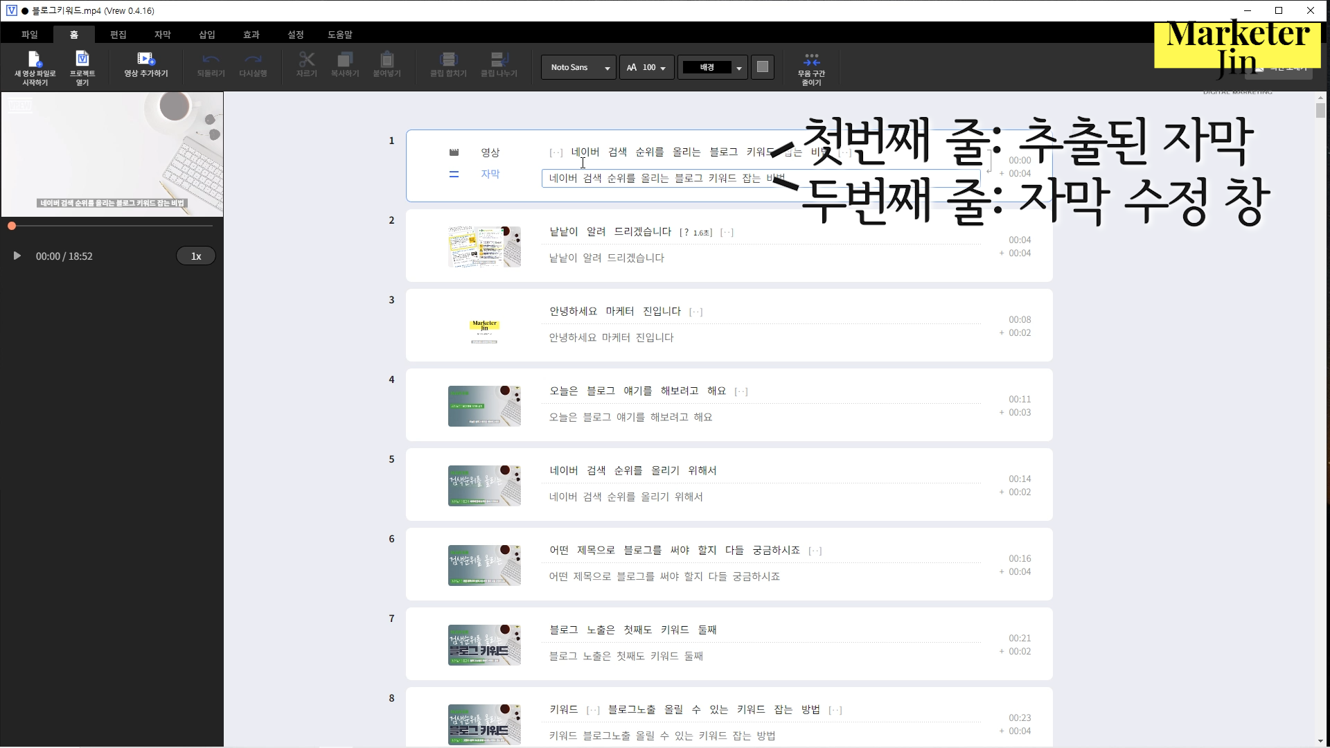 VREW가 분석해서 추출한 자막을 편집하면 됩니다.
