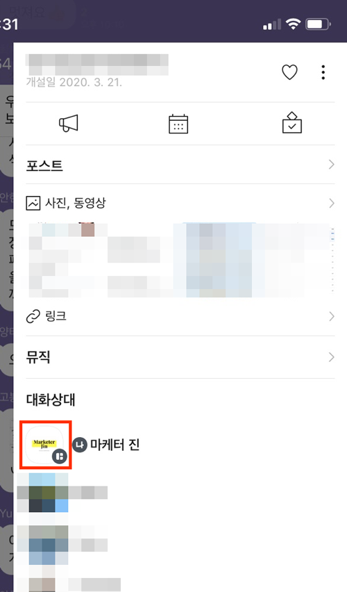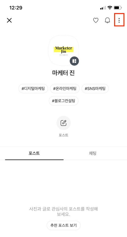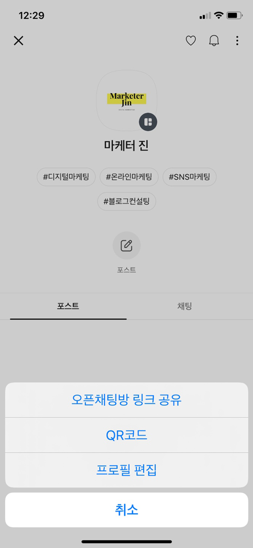 오픈 프로필에 들어가셔서 오른쪽 상단의 메뉴를 선택하시면 다양한 메뉴를 보실 수 있습니다.