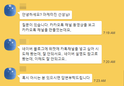 저희 단체카톡방에서 네이버 블로그에 카카오톡 채널 위젯 다는 방법에 대해 질문을 주신 분이 계세요.
