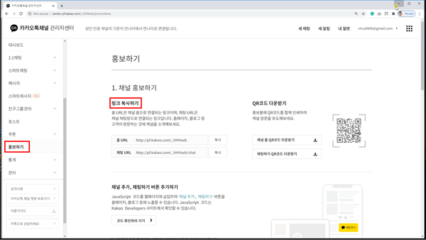 카카오톡채널 관리자센터에 로그인하셔서, 홍보하기 > 링크 복사하기