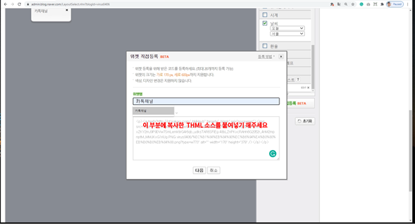 위젯 코드 입력 부분에 복사하신 html 코드를 붙여넣기 해주세요.