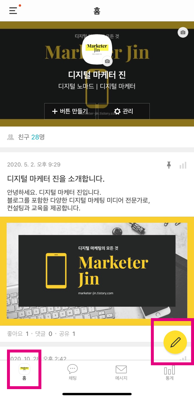 노란색 연필모양 버튼을 누르시면 포스트 작성 페이지로 바로 넘어갑니다.