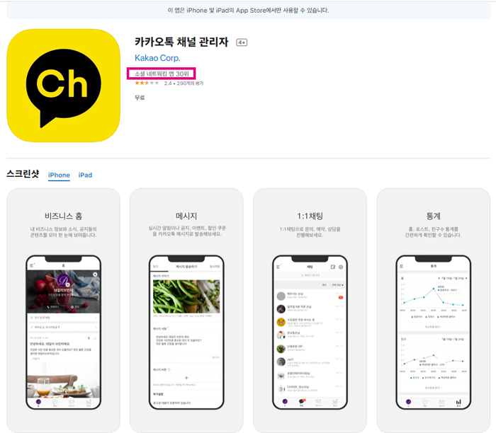 카카오톡 채널 관리자 앱이 아이폰 앱스토어 소셜네트워킹 앱 30위라네요.
