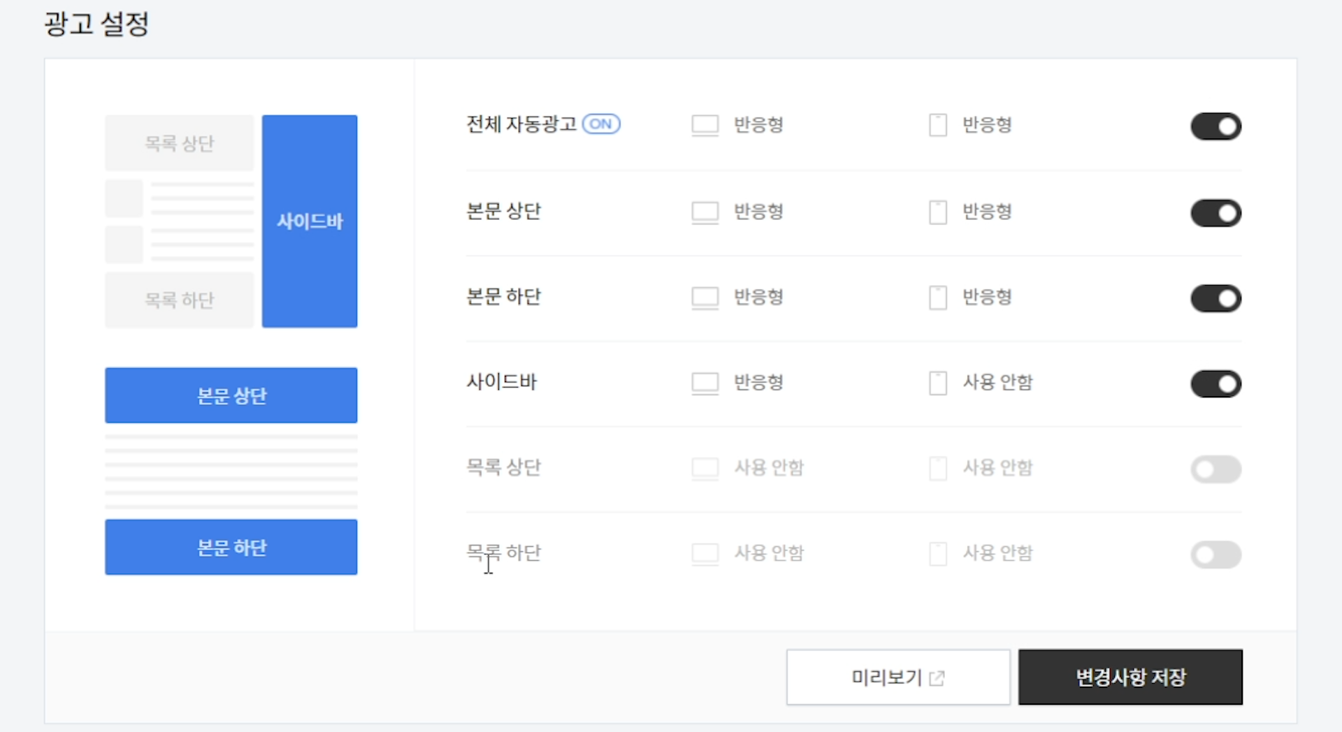 아래 보시는 대로, 전체 자동광고, 본문 상단 / 하단, 사이드바 까지 클릭만 하면 쉽게 광고를 달 수 있습니다.