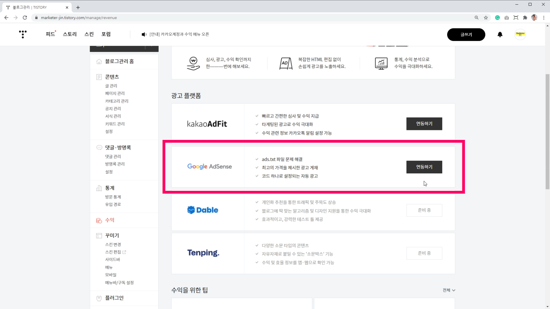 수익 창출 관련해서도 카카오 애드핏으로 더 많이 유도를 하는 느낌이네요.