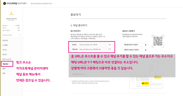 링크 주소는 역시 카카오톡 채널 관리자센터에서 받으실 수 있습니다.