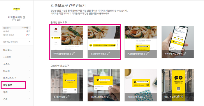 채널 홍보 메뉴의 '홍보도구 간편만들기'에 보시면, 홍보에 활용할 수 있는 여러 이미지를 다운받으실 수 있습니다.