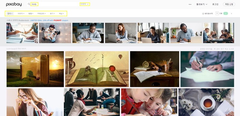 가장 첫 줄에 검색된 작은 이미지들은 셔터스톡에서 제공하는 유료 이미지들인데, 가끔 무료에서는 찾아볼 수 있는 꼭 맞는 이미지가 나타나 번뇌를 불러일으키곤 한다.