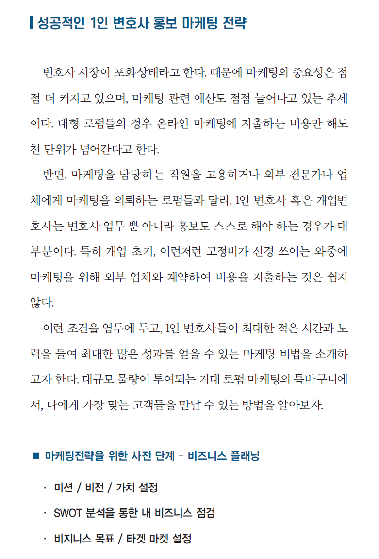 | 성공적인 1인 변호사 홍보 마케팅 전략 |
