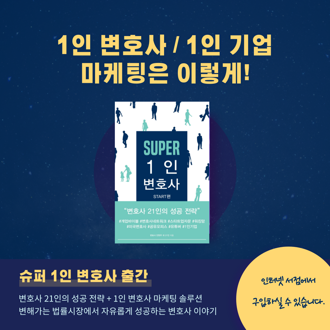2020년에 ‘슈퍼 1인 변호사’라는 책을 통해 변호사 마케팅에 필요한 내용들을 정리한 바 있었습니다. 이 책은 여전히 개업을 준비하시는 많은 변호사님들께서 참고하시는 좋은 자료로 활용되