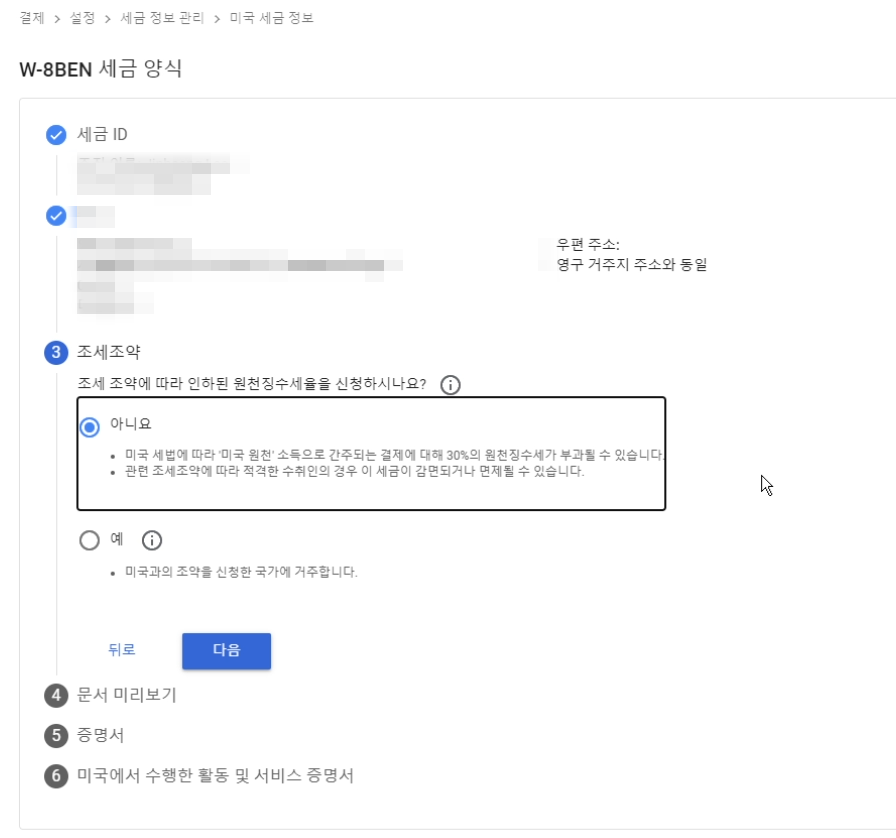 여기서 앞에 TIN 넘버를 가지고 계신 분들이나 미국 사회보장번호를 가지고 계신 분들이나 사업자 등록 번호를 넣으신 분들은 ‘예’ 선택하셔야겠죠.