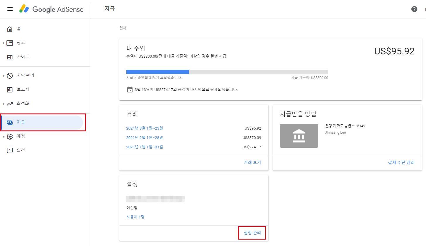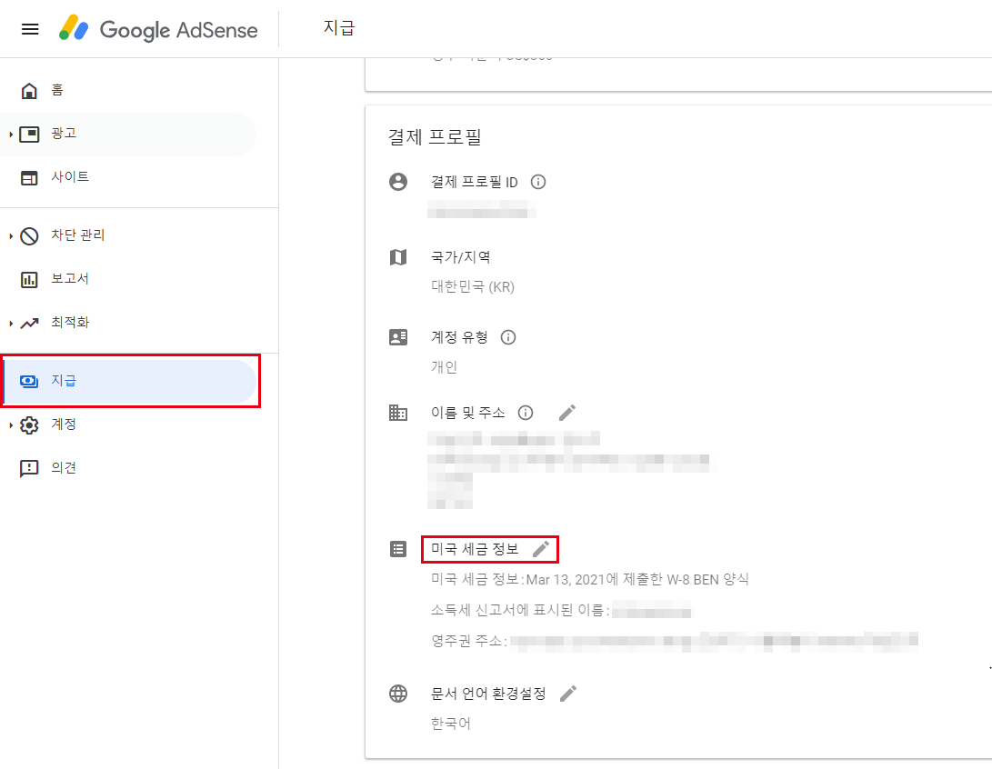 애드센스 계정에 로그인 > 지급 > 설정 관리 > 미국 세금 정보 > 세금 정보관리