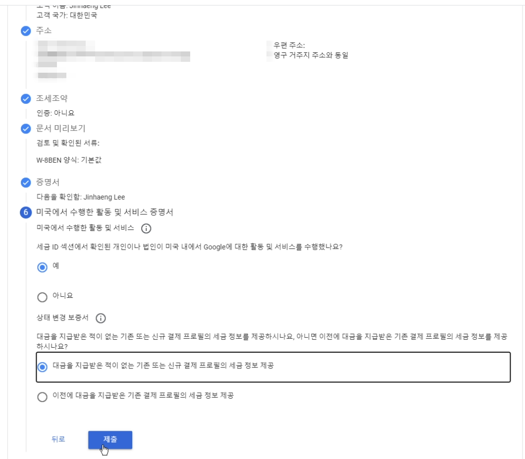 이렇게 구글 애드센스에 세금 정보 등록이 끝났습니다.