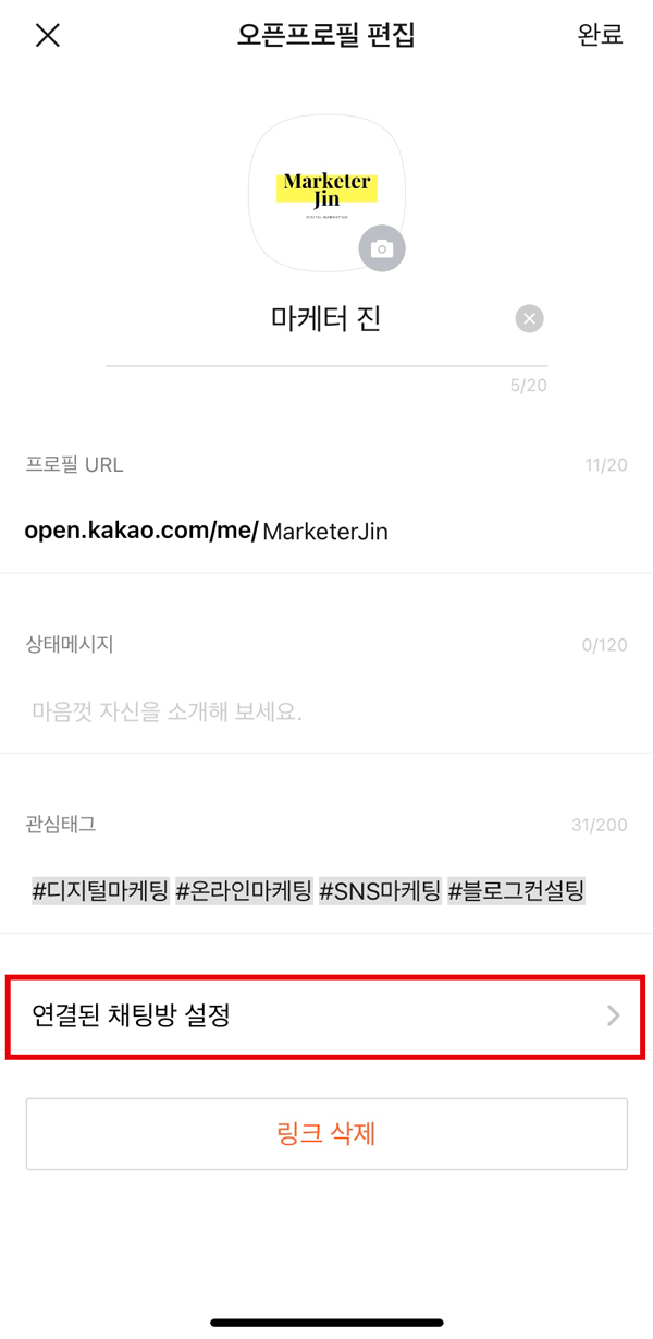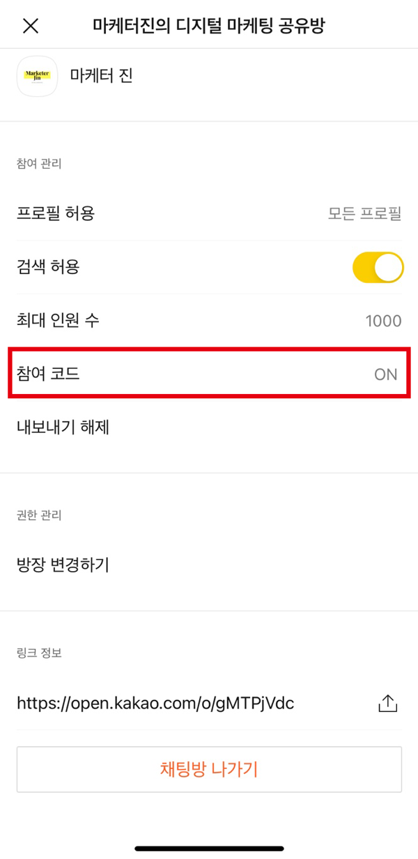 우선 오픈프로필로 1:1 채팅을 할 때 필요한 참여코드 지정하는 방법부터 설명해드릴께요.