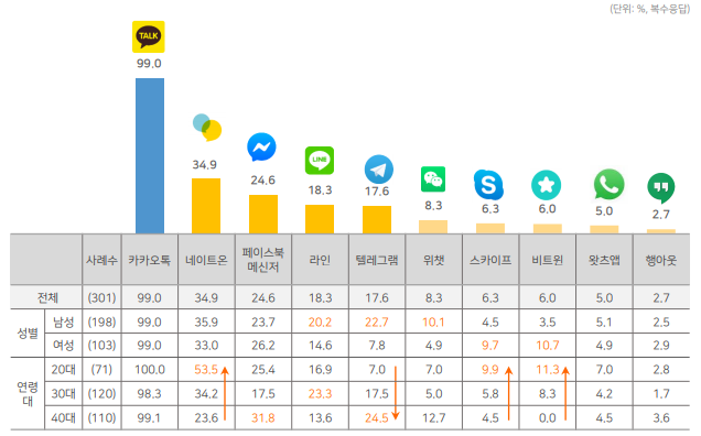 KT경제경영연구소에서 발행한 2019 모바일 메신저 앱 이용 행태 보고서에서도 가장 이용 경험이 많은 모바일 메신저 앱은 ‘카카오톡’인 것으로 나타났다. 한국의 모바일 메신저 앱 이용자의 99%가 카카오톡을 이용하고 있다고 한다. 이는 2위 네이트온, 3위 페이스북 메신저, 4위 라인, 5위 텔레그램 이용 경험률을 합친 것 보다 큰 수치로, “카카오톡의 독보적인 존재감을 확인할 수 있음”이라고 보고서에서도 밝히고 있다.
