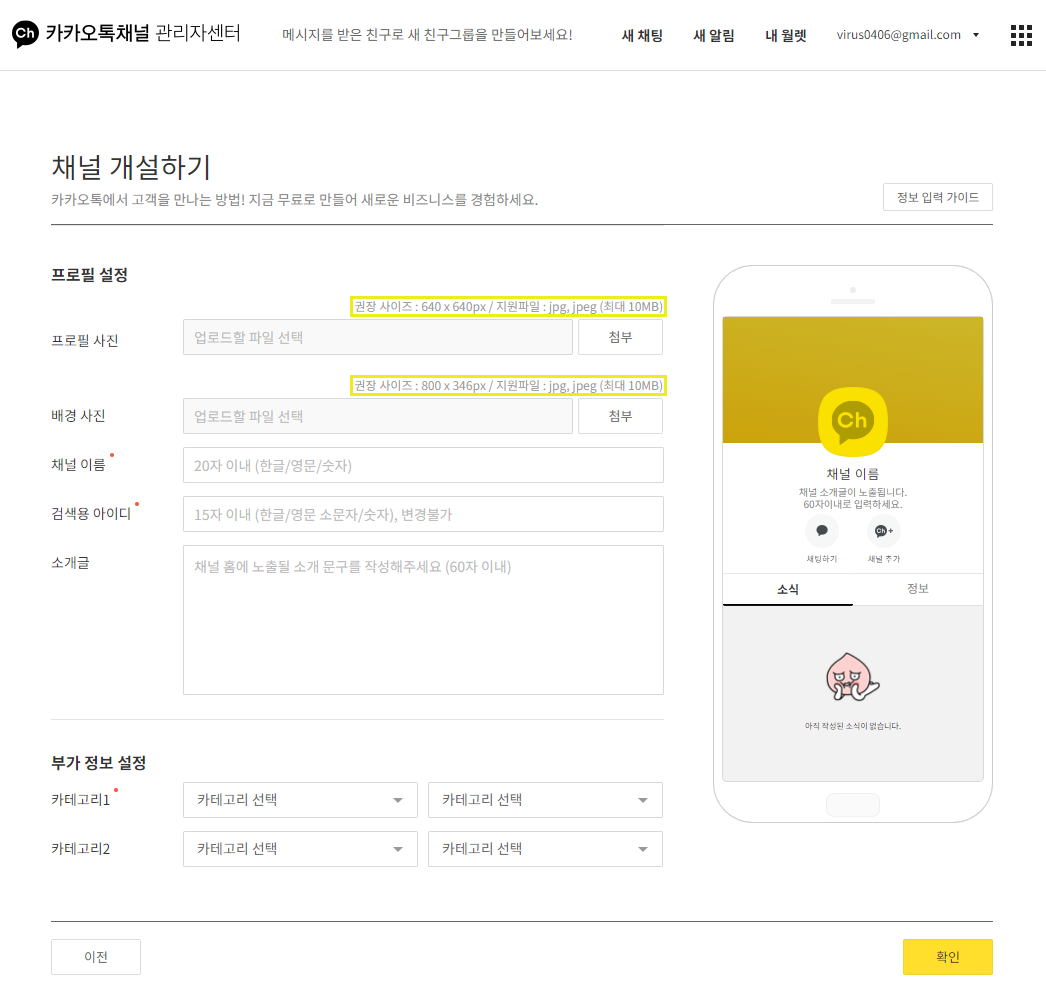 준비할 것은 자신의 카카오톡 계정, 그리고 채널에 들어갈 배경 화면과 프로필 이미지를 미리 준비해두면 좋다.