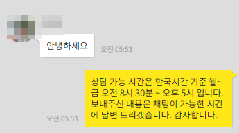 채널을 통한 1:1 채팅은 채팅 시간을 설정할 수 있어서, 상담을 원하지 않는 시간에는 자동 답변만 남길 수 있어서 시간 관리에 유용하다.