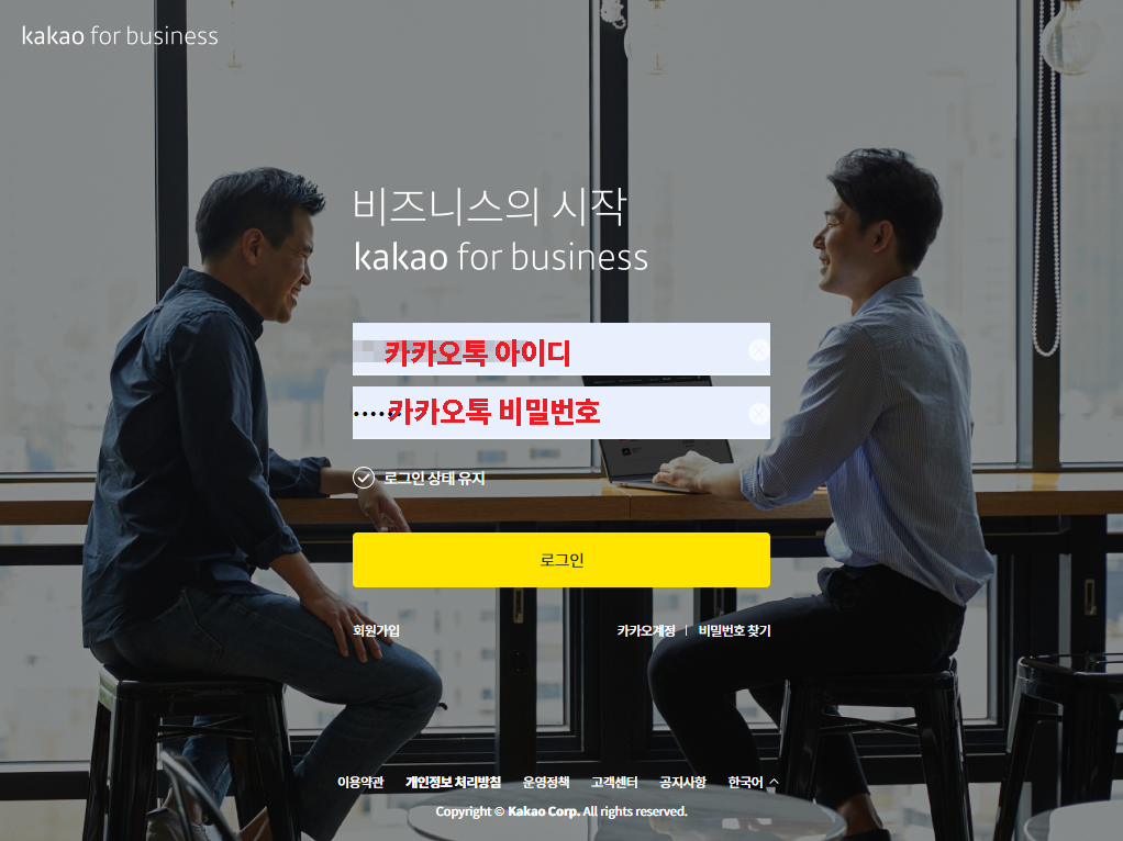 Kakao for Business 카카오 for 비즈니스는 카카오의 다양한 비즈니스 서비스를 경험할 수 있는 통합 비즈니스 플랫폼입니다.