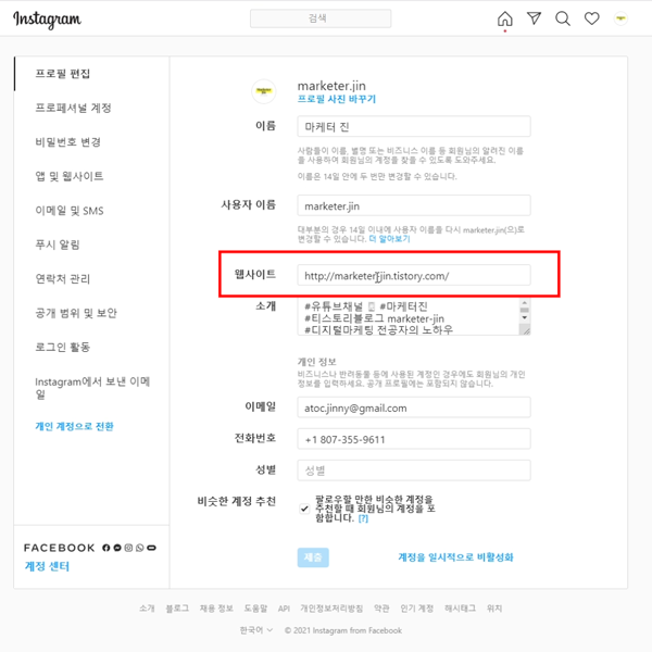복사한 주소를 인스타그램 프로필에 가서 붙여주세요.