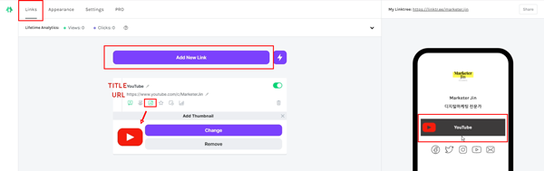 가장 본론이라고 할 수 있는 링크 설정 영역입니다. 오른쪽 미리보기 창에서 어떻게 표시되는지 보면서 설정하실 수 있습니다.링크는 여러 개 넣을 수 있습니다.