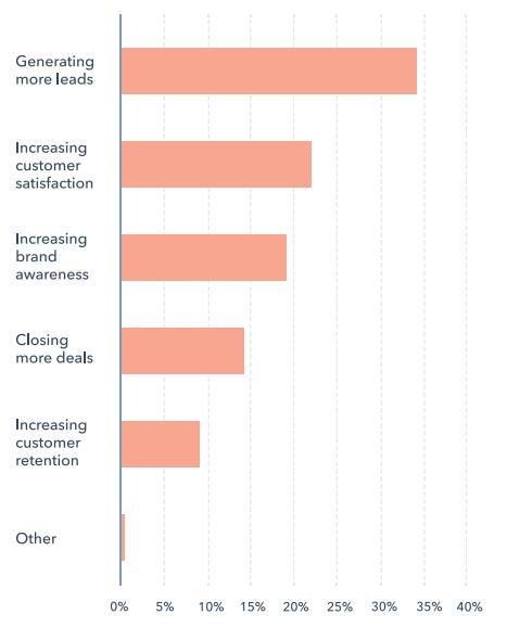 마케팅 우선순위를 붇는 질문에서 가장 큰 비율을 차지한 답변은 리드를 창출하는 것이었습니다. 다시 말해, 마케팅을 통해 더 많은 사람들이 목표로 하는 페이지 (상품 페이지 등)에 도달하게 하는 것이죠.
