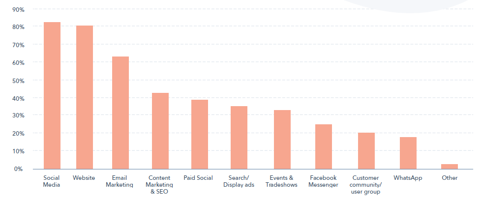 다시 말해, 마케팅의 목표는 더 많은 리드를 창출하는 것이지만, 대부분의 캠페인은 브랜드 인지도 향상을 위해 실행되고 있습니다. 그리고 소셜미디어 및 인플루언서를 이용한 캠페인이 점점 더 많이 사용되고 있습니다.