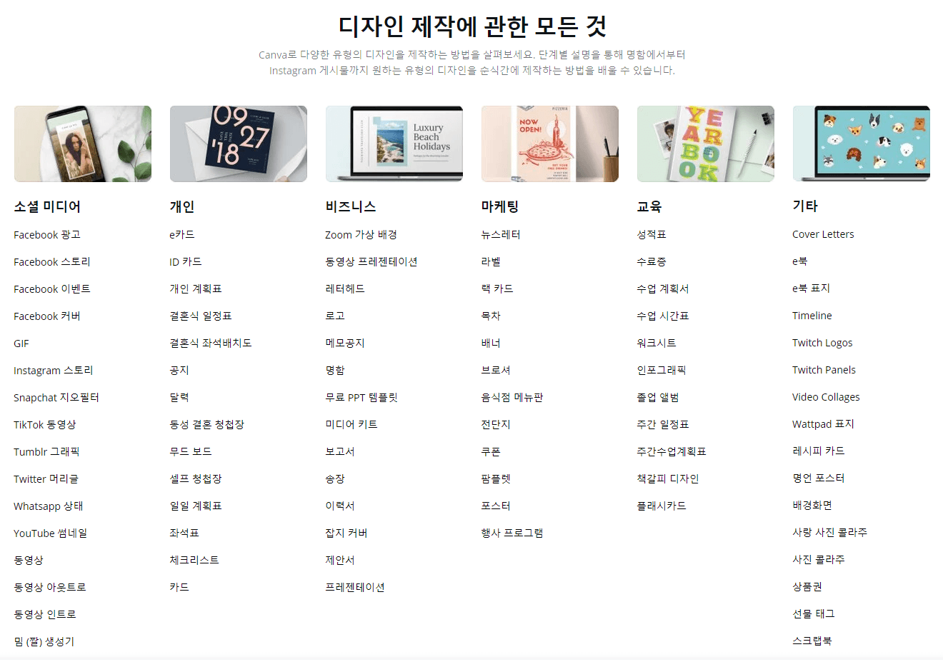 인스타그램, 페이스북 등의 소셜미디어 포스트, 각종 비즈니스 문서 및 PPT 템플릿, 명함, 전단지 및 브로셔, 청첩장과 ZOOM 가상 배경까지, 상상할 수 있는 모든 유형의 디자인을 제작할 수 있습니다. 요즘은 유튜브 썸네일이나 인스타그램 스토리는 물론이고 이력서와 PPT도 캔바로 만든답니다!