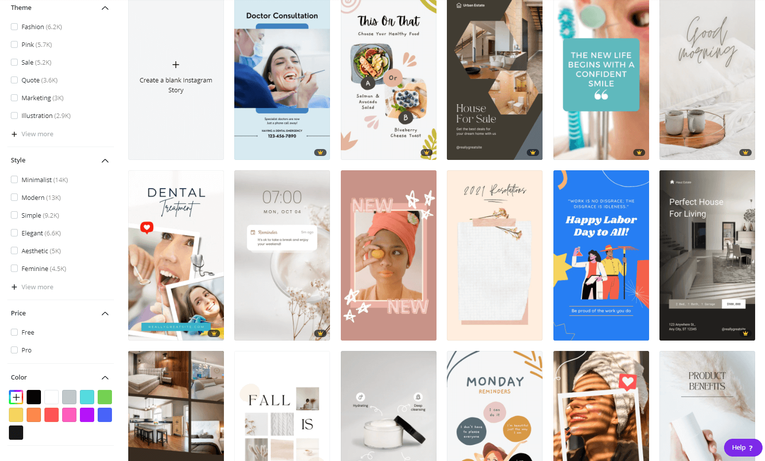 우선 인스타 스토리 템플릿을 보면요, 이 영역에만 3만여개의 템플릿이 있습니다. 주제, 컬러 등에 맞게 분류해서 볼 수도 있습니다.