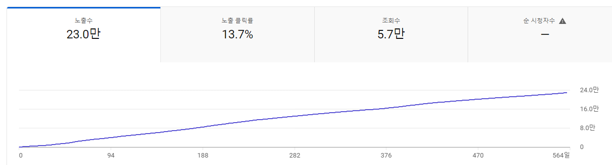 제가 예시로 들었던 콘텐츠의 경우, 유튜브 업로드 이후 1년 6개월 정도가 지난 지금 총 노출수는 23만, 총 조회수는 5만 7천입니다.