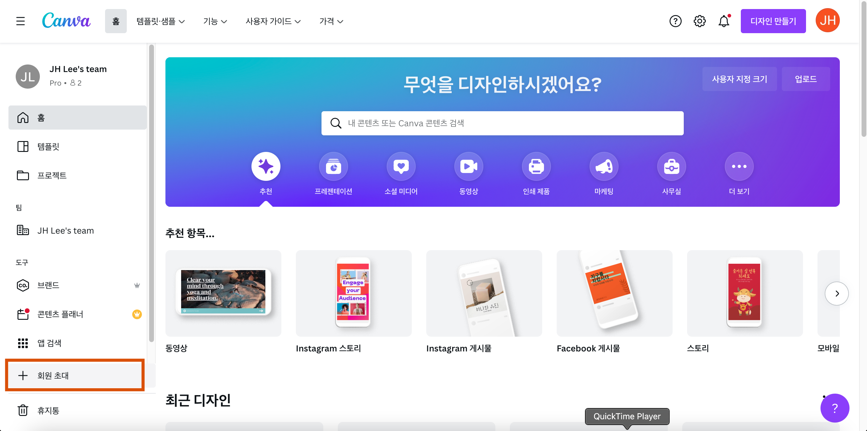 캔바 프로 계정은 팀원들과 공유할 수 있습니다. 5명까지 초대 가능!