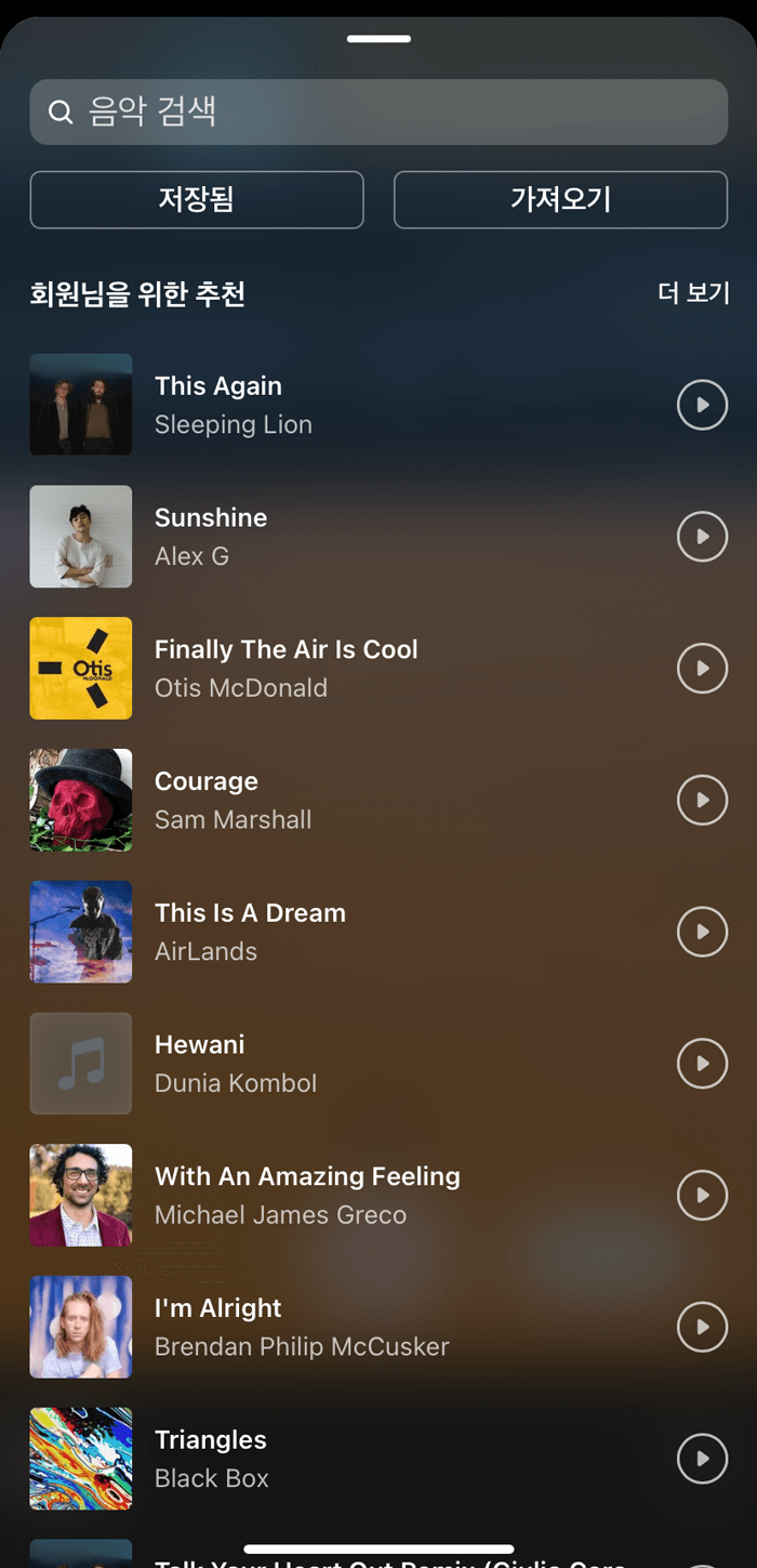 - 본인이 저장한 음악, 이전 릴스에서 썼던 음악을 볼 수 있습니다.