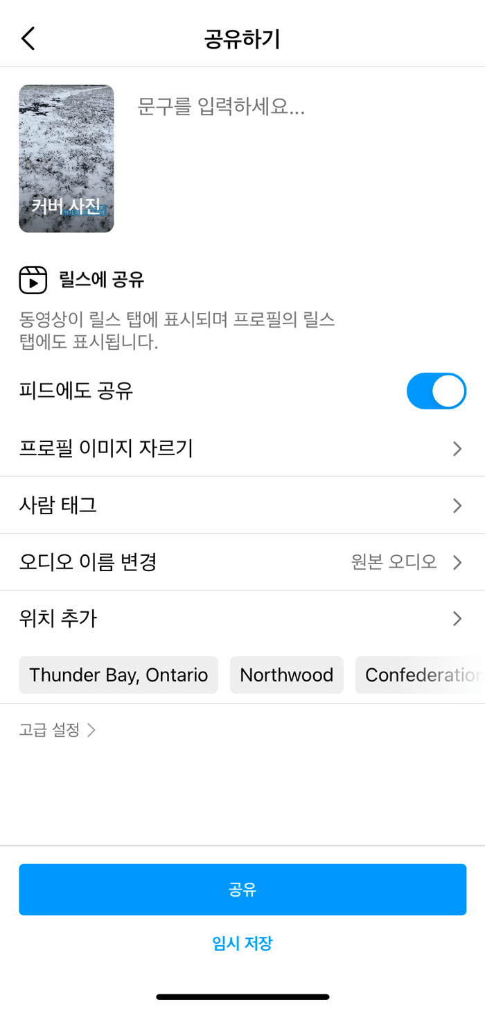 릴스를 피드에 공개할 지 선택할 수 있습니다.