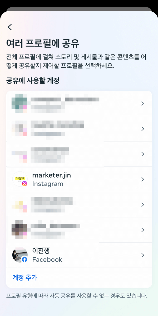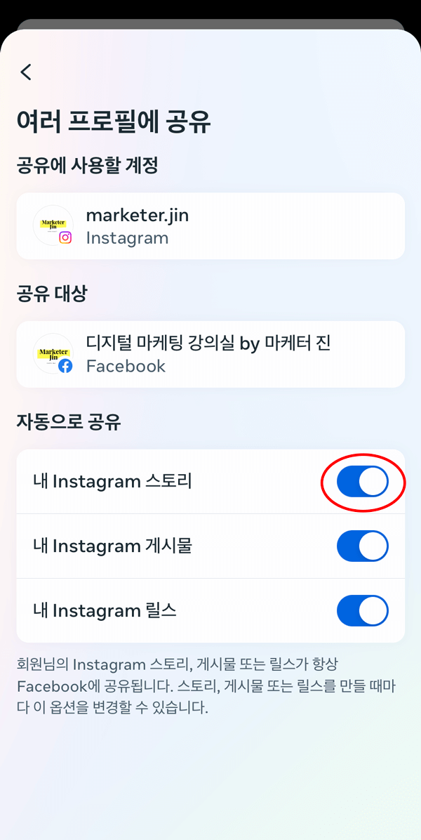 인스타 스토리가 페이스북에 공유되지 않는 분은 위의 화면에서