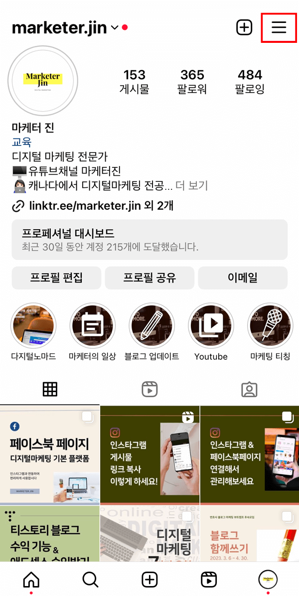 인스타 앱에서 본인의 프로필로 들어가신 다음 아래 이미지를 순서대로 따라하시면 됩니다.